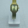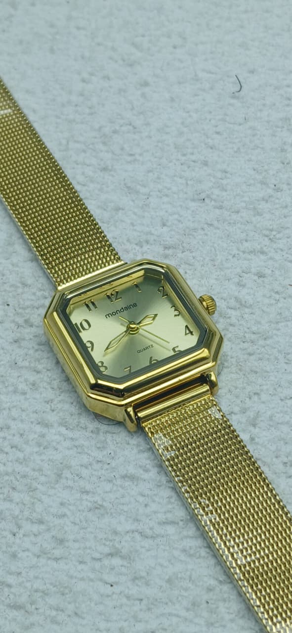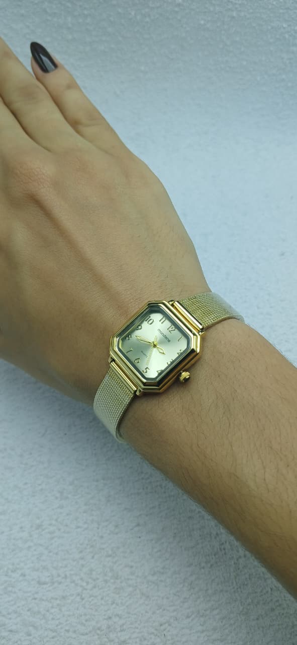 Metal dourado – Pulseira esteira – Não é a prova d’água (somente resistente) – Caixa quadrada